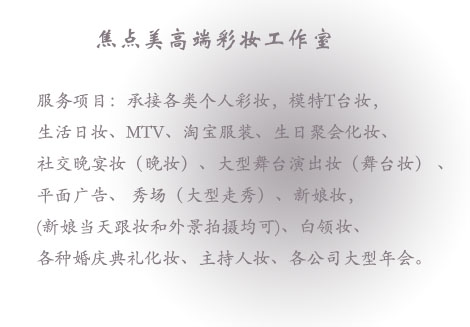 焦点美高端彩妆服务项目:承接各类个人彩妆,模特T台妆,生活日妆、MTV、淘宝服装、生日聚会化妆、社交晚宴妆(晚妆)、大型舞台演出妆(舞台妆) 、平面广告、 秀场(大型走秀)、新娘妆,(新娘当天跟妆和外景拍摄均可)、白领妆、各种婚庆典礼化妆、主持人妆、各公司大型年会。15219496419(微信)